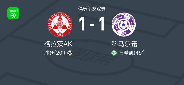 在一场俱乐部友谊赛中,格拉茨AK与科马尔诺展开较量。比赛过程中,沙廷为格拉茨AK率先取得进球,展现出良好的进攻状态。随后,马希凯为科马尔诺主罚点球命中,成功将比分扳平。双方在攻防两端均有表现,但未能再度改写比分。最终全场结束,格拉茨AK以1-1战平科马尔诺。