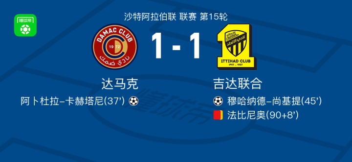 北京时间1月14日,沙特阿拉伯职业联赛第15轮,达马克坐镇主场迎战吉达联合。比赛中,达马克率先取得进球,里亚德-沙拉希利送出助攻,阿卜杜拉-卡赫塔尼成功破门,为主队建立领先优势。随后,吉达联合由穆哈纳德-尚基提攻入一球,将比分扳平。下半场补时阶段,吉达联合球员法比尼奥因累计两张黄牌被罚离场。最终全场比赛结束,双方以1比1握手言和。