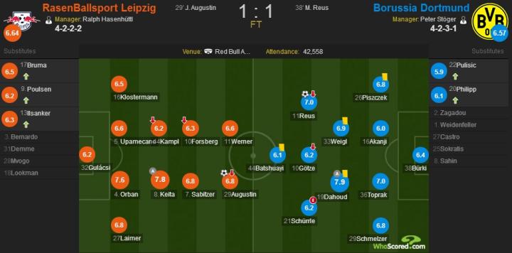 莱比锡方面,奉献一次助攻的凯塔获得了全队最高的7.8分;多特方面,同样送出精彩助攻的达胡德获得了全场最高的7.9分!