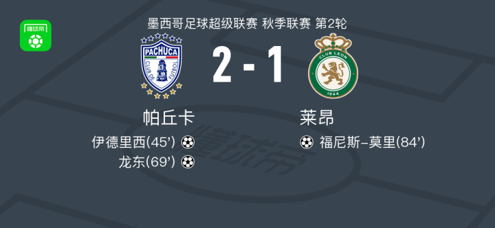北京时间1月14日墨西哥足球超级联赛 秋季联赛 第2轮,帕丘卡主场对阵莱昂。帕丘卡伊德里西破门,龙东破门。莱昂福尼斯-莫里破门。最终比分帕丘卡 2-1 莱昂。