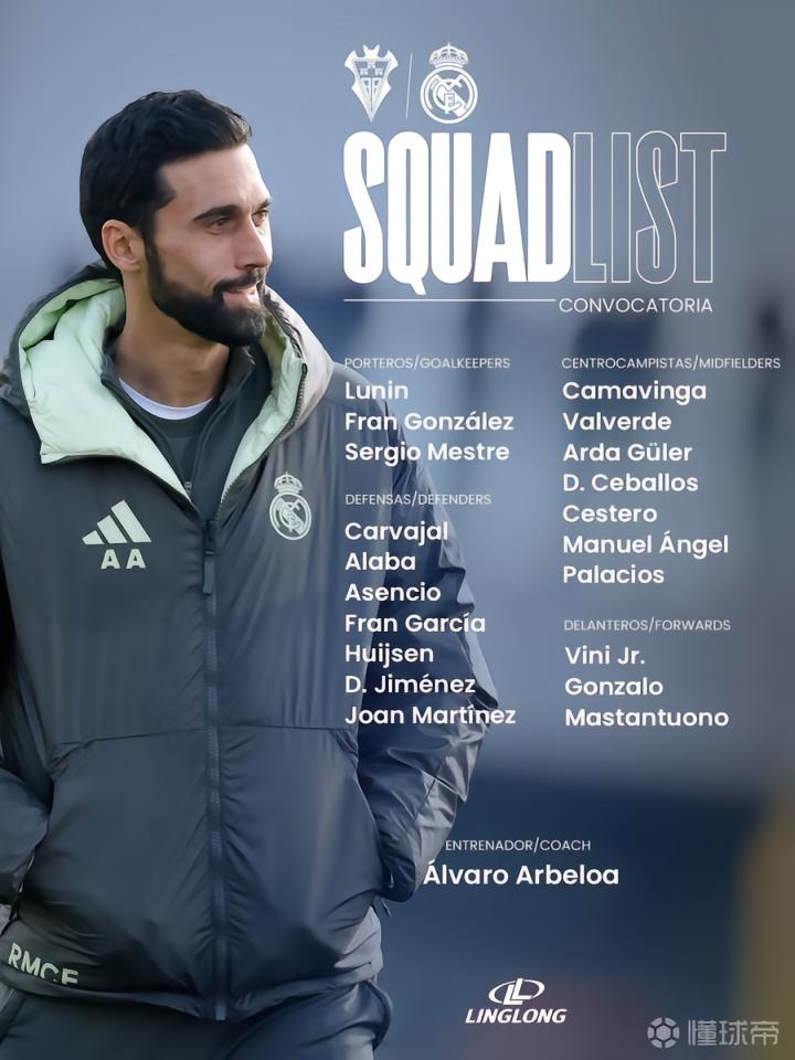 皇家马德里官方公布了国王杯1/8决赛客场对阵阿尔瓦塞特的比赛大名单,维尼修斯领衔,多名皇马B队球员在列,这也是阿韦洛亚执教皇马的首秀。