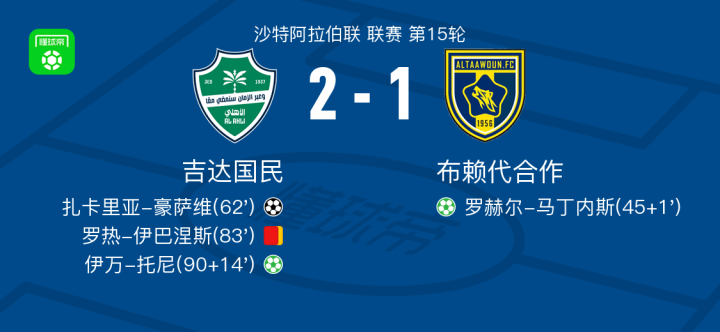 北京时间1月15日沙特阿拉伯联 联赛 第15轮,吉达国民主场对阵布赖代合作。吉达国民扎卡里亚-豪萨维破门,伊万-托尼破门。布赖代合作罗赫尔-马丁内斯破门。最终比分吉达国民 2-1 布赖代合作。