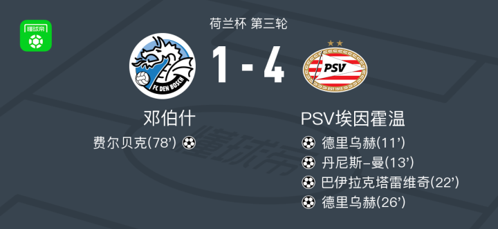 北京时间1月15日,荷兰杯第三轮展开较量,邓伯什迎战PSV埃因霍温。比赛中,PSV埃因霍温率先发力,西尔迪利亚送出助攻,德里乌赫接球后破门得分。随后不久,丹尼斯-曼攻入一球,进一步扩大领先优势。第22分钟,巴伊拉克塔雷维奇抓住机会再下一城,将比分拉开。第26分钟,德里乌赫再度建功,完成梅开二度,帮助球队确立四球领先。第78分钟,费尔贝克为邓伯什扳回一城,打破对方球门。最终全场比赛结束,比分为1比4,PSV埃因霍温取得胜利。