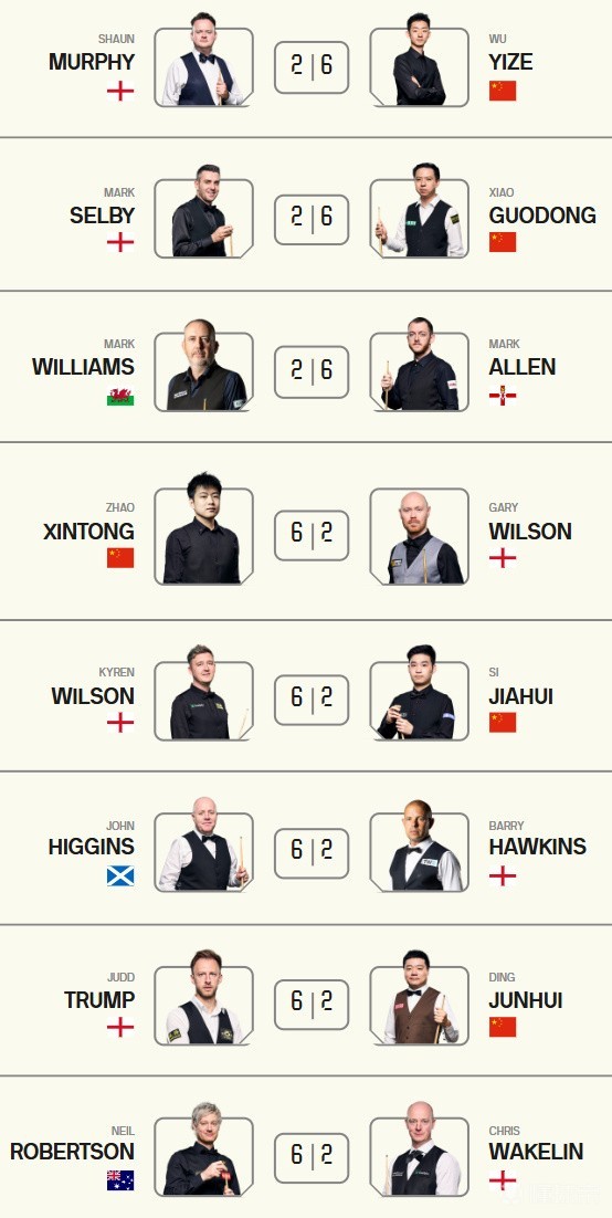 吴宜泽6-2墨菲;肖国栋6-2塞尔比;马克-艾伦6-2马克-威廉姆斯;赵心童6-2加里-威尔逊