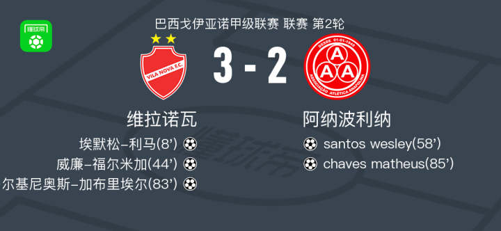 北京时间1月15日,巴西戈伊亚诺甲级联赛第二轮展开争夺,维拉诺瓦坐镇主场迎战阿纳波利纳。比赛中,埃默松-利马率先为维拉诺瓦打破僵局,随后威廉-福尔米加再下一城,帮助球队扩大领先优势。上半场结束前,维拉诺瓦以两球领先。 易边再战,阿纳波利纳由santos wesley破门扳回一球,掀起反扑势头。进入比赛末段,马尔基尼奥斯-加布里埃尔为维拉诺瓦再度进球,稳定了场上局势。但不久后,chaves matheus为阿纳波利纳追回一分。最终,维拉诺瓦以3比2战胜阿纳波利纳,收获胜利。