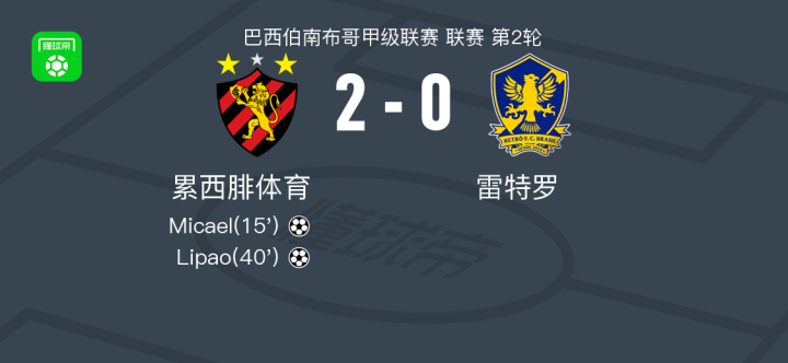 北京时间1月15日,巴西伯南布哥甲级联赛第二轮,累西腓体育坐镇主场迎战雷特罗。比赛中,Micael率先打破僵局,为球队取得领先。随后Lipao再下一城,帮助球队扩大优势。凭借这两粒进球,累西腓体育以2比0战胜对手,全取三分。