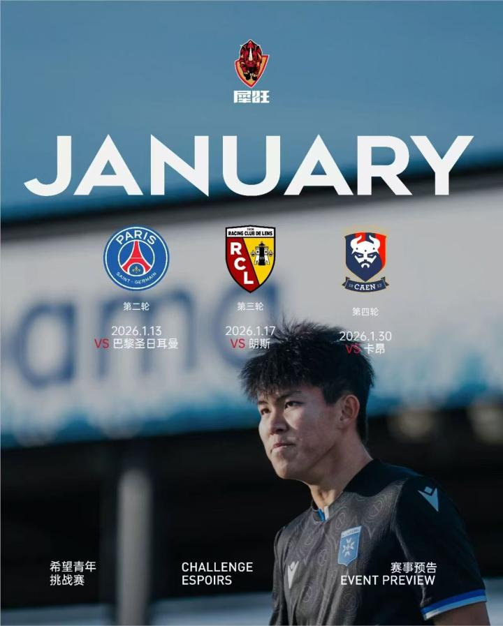 2026年1月13日,希望挑战赛第2轮,中国犀旺队客场对阵巴黎圣日耳曼U19,比赛于巴黎时间15:00开球。