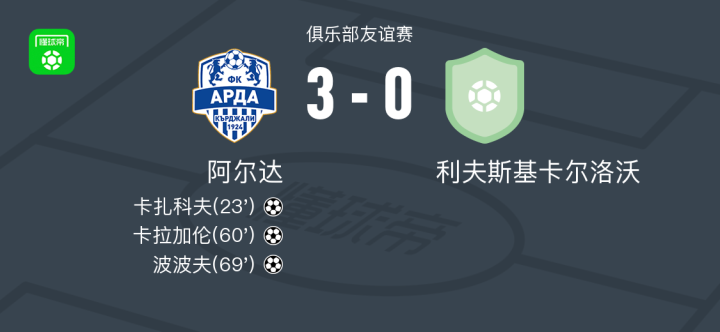 在一场俱乐部友谊赛中,阿尔达与利夫斯基卡尔洛沃展开较量。比赛中,卡扎科夫率先为阿尔达取得进球,帮助球队打开局面。随后,卡拉加伦接续攻势,攻入第二粒进球,进一步扩大领先优势。比赛后段,波波夫再下一城,锁定胜局。最终,阿尔达以3-0战胜利夫斯基卡尔洛沃。