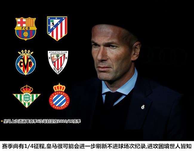尽管遣上的大多是B队成员,但周中输给西班牙人的比赛还是让皇马上下很没面子。在先后遭到皇家贝蒂斯、马德里竞技、巴塞罗那、比利亚雷亚尔和毕尔巴鄂零封之后,白衣军团又在昔日的送分童子那里收获闭门羹,球队自穆里尼奥时代元年以来再次次遭遇赛季6场零封。考虑到赛季尚有近1/3未完成,齐达内的球队很有可能会进一步刷新这项尴尬的纪录。