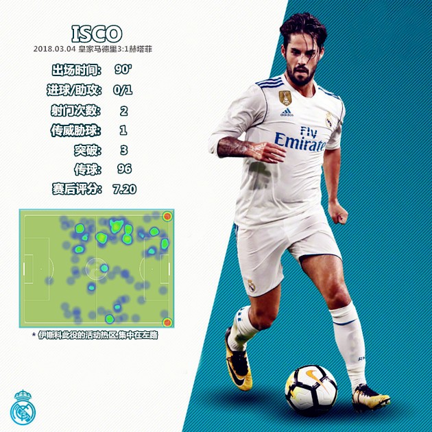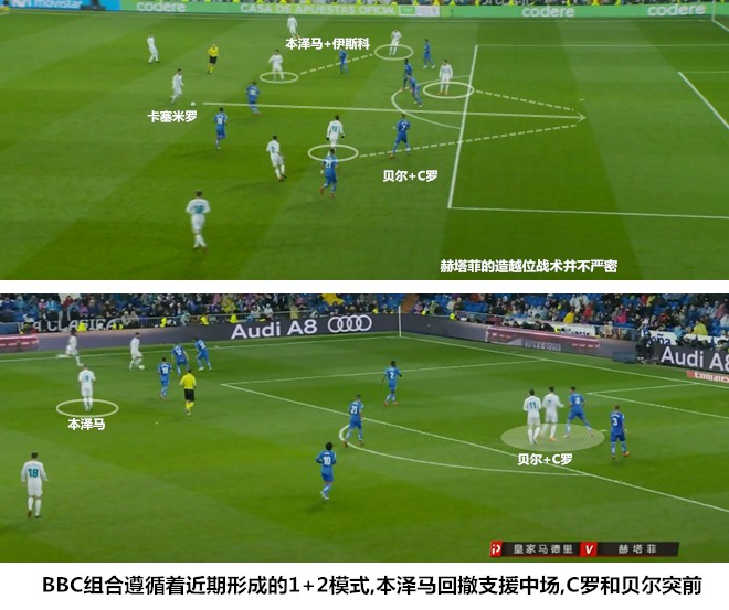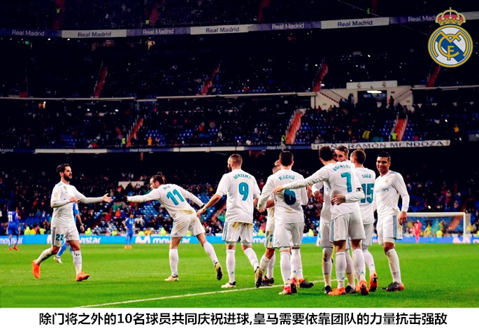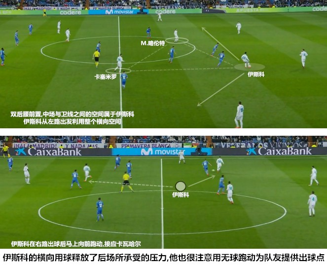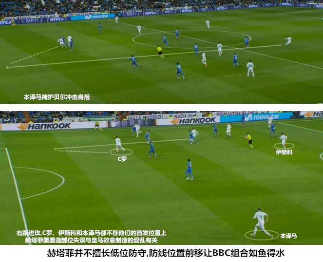 在莫德里奇、克罗斯和马塞洛同时缺阵的情况下,伊斯科几乎就是皇马中场最为稳定的推进和串联者。BBC成员都具备回撤接应和向前发展的能力,但他们的活动范围、用球思路和持续进行跑动接应的能力都不如伊斯科。当然,伊斯科的串联和“两亿”的积极戍边,并不能完全弥补三名大将缺阵带来的中场创造力缺口。在成功地化解了对手的前场逼抢后,皇马在利用长传打击赫塔菲身后空当的同时,加强了前场四人组之间的轮换,此举可以制造出更多的变化,依靠人员的流动完成提速,避免过多的程式化对位,减少锋线球员被对手侵犯的可能。