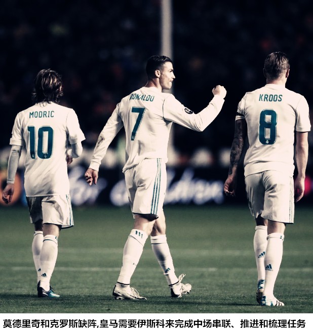 本泽马更多地回撤衔接中场的锋线,C罗和贝尔内冲击身后的机会,经过数十场比赛(贝尔复出后)的磨炼,属于BBC的全新进攻套路已经形成。从理论上来说,本泽马的外围化打法会侵占原本属于伊斯科的空间,如果不是因为莫德里奇、克罗斯和马塞洛同时受伤,伊斯科或许不会得到首发机会。尽管风评一般,连续两场担任首发的伊斯科仍有可能承担一周双赛任务,除了像此役一样在BBC身后衔接三线,伊斯科还能成为了三中场体系(451阵型)中的一环。