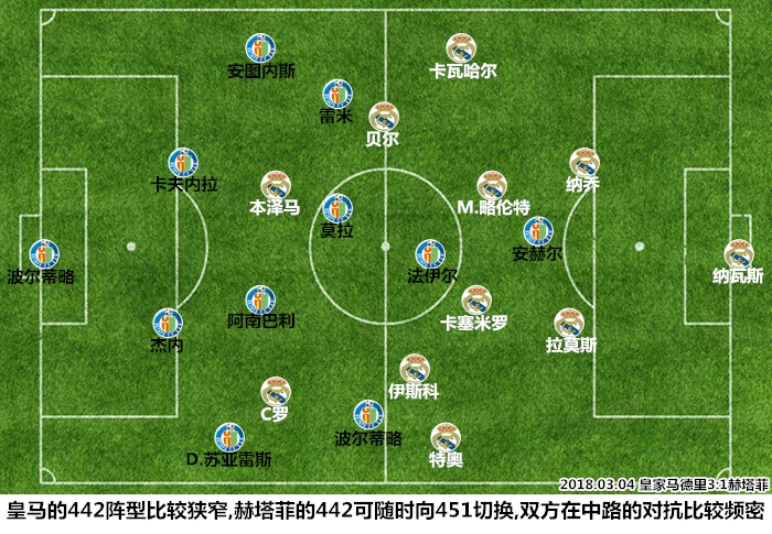 在经历了一个成绩起伏较大的2017收官阶段后,赫塔费在近期的状态明显上扬。在进入2018年后,赫塔菲仅在客场输给了马德里竞技和比利亚雷亚尔,在做客诺坎普和皮斯胡安的比赛中,博尔达拉斯的球队都能凭借顽强的防守取得分数。在这一轮的抢分之旅中,来自卡斯蒂利亚的前锋安赫尔-罗德里格斯和老将莫利纳表现尤为抢眼,创造力出众的日本中场柴崎岳因为打法和位置的原因并不能确保主力身份。此役,博尔达拉斯沿用了做客诺坎普时的强化对抗、力拼中场的策略,位置灵活的法伊尔决定着赫塔菲的阵型形态,他会在高位压迫阶段和搭档安赫尔一起压迫皇马的中卫,在阵型整体向后收缩时配合身后的四名球员绞杀皇马的三中场。