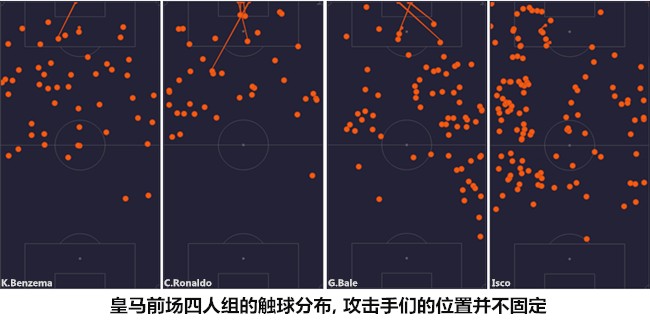 在以往BBC同时首发的比赛中,皇马往往会出现中前场球员回防到位率不高,以及横向联系不足导致两翼各自为战的问题。齐达内此役排出的阵型并不是标准化的433阵型,它在进攻时呈4-2-1-3站位,防守时收缩为中场比较狭窄的442。从两翼出发的伊斯科和贝尔并不是边前腰,前者在推进时负责横向串联,后者的内收是为了避免边路的角力、更好地前插射门。通过对比可知,伊斯科和贝尔本场的角色设定与阿森西奥和巴斯克斯(做客莱加内斯)的打法极为相似,从保证战术延续性的角度考量,齐达内在做客巴黎的比赛中能排出四种不同的边路组合,四名球员并不存在明显的主次之分,其中的两人将作为替补准备"接力跑"。