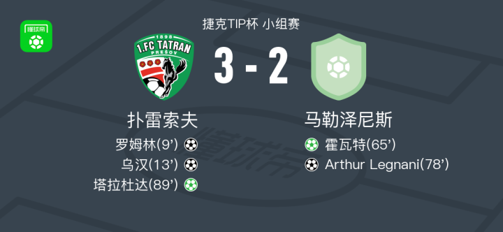 北京时间1月15日捷克TIP杯 小组赛,扑雷索夫对阵马勒泽尼斯。扑雷索夫罗姆林破门,乌汉破门,塔拉杜达破门。马勒泽尼斯霍瓦特破门,Arthur Legnani破门。最终比分扑雷索夫 3-2 马勒泽尼斯。