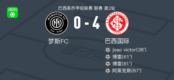 北京时间1月16日,巴西高乔甲级联赛第二轮展开较量,梦斯FC主场迎战巴西国际。比赛中,joao victor率先为客队打破僵局,帮助巴西国际取得领先。随后,博雷接阿吉雷的助攻再下一城,进一步扩大比分优势。比赛后段,布鲁诺-戈麦斯送出助攻,博雷再次破门完成梅开二度。临近结束前,博雷反击中精准传球,助攻阿莱克斯推射得手。最终,巴西国际以4比0战胜梦斯FC。