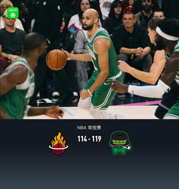第四节热火亚库契奥尼斯拿下8分,凯尔特人安芬尼-西蒙斯拿下18分,最终热火114-119不敌凯尔特人