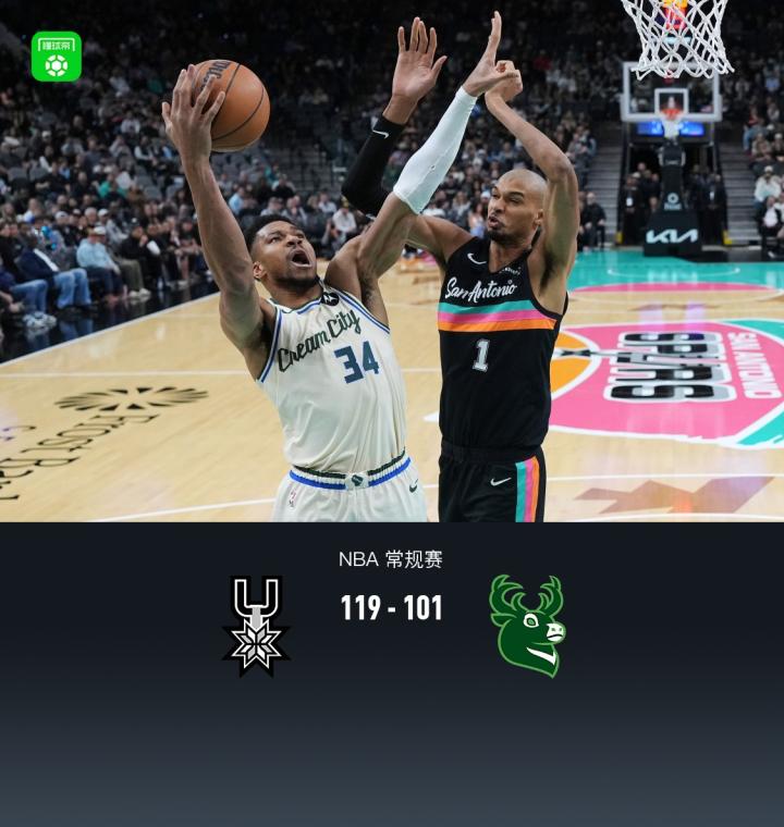 马刺119-98送雄鹿3连败,文班亚马22+10,字母哥21分