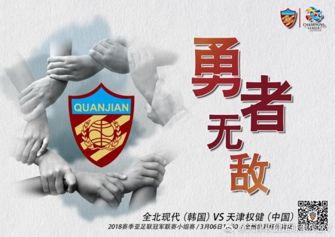 北京时间3月6日,中超天津权健就将在客场对阵韩国的全北现代,今天,权健俱乐部发布了赛前海报:勇者无敌。