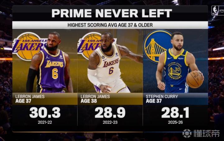 同样顶尖,37岁詹姆斯场均得分30.3分,高于37岁库里本赛季的28.1分