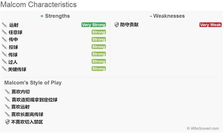 作为一名巴西边锋,马尔科姆自然也不例外拥有着出众的技术和灵巧性,和罗本类似,马尔科姆并不擅长右脚能力,且非常依赖自己的左脚技术,但仅21岁的他还有更高的上升空间,速度不快也仅仅是相对于同位置的边锋来说,巴西小将面对跟防的边后卫以速度完成突破是绰绰有余的;最为难能可贵的是,马尔科姆擅长和队友配合,并不会一味地单打独斗,且跑位意识十分出色;这对于一个准备进入豪门效力的球员来说是必须要养成的习惯。科林蒂安时期在一众巴西国脚身后打配合的马尔科姆得到了更多和队友配合的机会,在波尔多被几名主教练都树立成核心又将他的单兵作战和带动队友的能力激发了出来。若是拜仁肯花下大价钱将他带到安联球场,风格和罗本更为类似的马尔科姆在罗本的指导下还会更上一层楼,两人都是左脚将且十分擅长内切后的射门,强有力的弧线球远射也是这位巴西小将的金字招牌,不得不说小飞侠和这位巴西小将之间在比赛风格上一定会十分有共同语言。