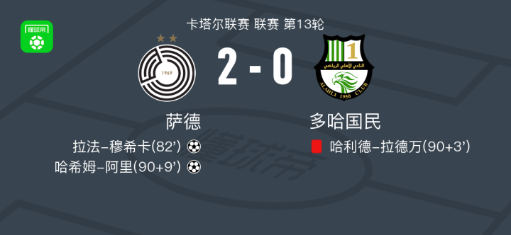 北京时间1月17日,卡塔尔星级联赛第13轮,萨德坐镇主场迎战多哈国民。比赛中,哈希姆-阿里送出助攻,拉法-穆希卡接球后完成破门,为萨德先拔头筹。临近比赛结束,多哈国民球员哈利德-拉德万因犯规被红牌罚下。补时阶段,阿菲夫送出关键传球,哈希姆-阿里抓住机会再入一球,将比分锁定。最终,萨德以2比0战胜多哈国民。
