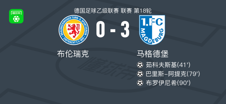 北京时间1月17日,德国足球乙级联赛第18轮展开争夺,布伦瑞克坐镇主场迎战马格德堡。比赛中,马格德堡率先打破僵局,茹科夫斯基接队友传球后冷静施射得手,为球队取得领先。此后,马格德堡持续制造威胁,拉扬-加里卜先后两次送出精准助攻,巴里斯-阿提克和布罗伊尼希接连破门,进一步扩大比分优势。凭借这三粒进球,马格德堡客场3比0战胜布伦瑞克,全取三分。