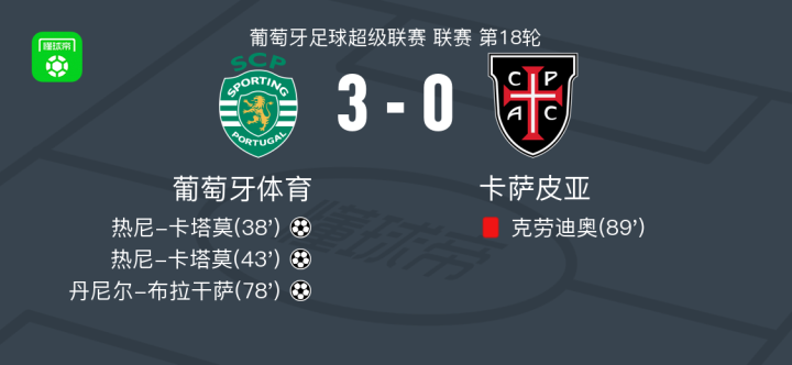 北京时间1月17日,葡萄牙足球超级联赛第18轮,葡萄牙体育坐镇主场迎战卡萨皮亚。比赛中,特林康送出精准助攻,热尼-卡塔莫冷静破门,为球队首开纪录。随后贡萨洛-伊纳西奥成功策动进攻,热尼-卡塔莫再下一城,完成梅开二度。下半场路易斯-苏亚雷斯送出关键传球,丹尼尔-布拉干萨推射得手,将比分进一步扩大。比赛临近结束前,卡萨皮亚球员克劳迪奥因犯规被直接红牌罚下。最终全场比赛结束,葡萄牙体育以3比0战胜对手。