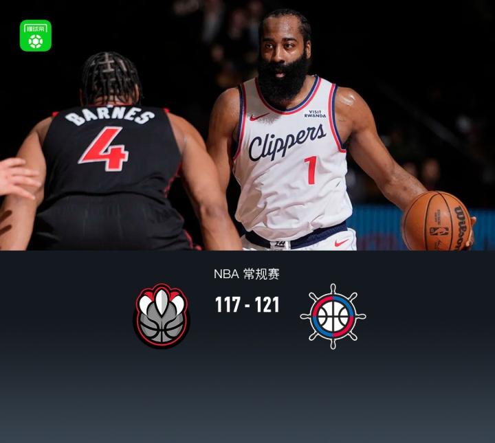 加时赛,上来哈登冲框造杀伤罚球连得4分,随后猛龙巴恩斯站出来持续得分,好在快船哈登、米勒站出来保持领先,最终猛龙117-121不敌快船。
