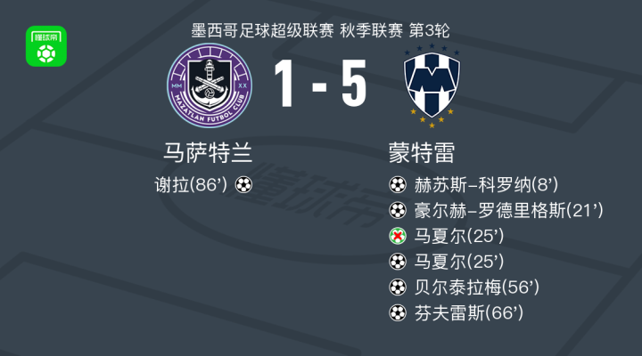 北京时间1月17日,墨西哥足球超级联赛秋季联赛第3轮,马萨特兰主场迎战蒙特雷。比赛开局阶段,蒙特雷率先打破僵局,赫苏斯-科罗纳接卡纳莱斯助攻完成破门。随后不久,豪尔赫-罗德里格斯再下一城,帮助客队扩大领先优势。紧接着,马夏尔主罚点球未能命中,但很快他再度获得机会并成功破门,进一步巩固球队优势。下半场易边再战,马夏尔先后两次送出助攻,贝尔泰拉梅与芬夫雷斯相继建功,将比分进一步拉开。临近比赛结束前,马萨特兰由加布里埃尔-洛佩斯助攻谢拉扳回一球。最终全场比赛结束,马萨特兰以1比5不敌蒙特雷。