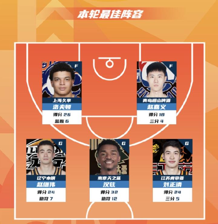 北京时间1月17日,CBA官方公布了常规赛第15轮的最佳阵容,上海外援洛夫顿、青岛球员赵嘉义、辽宁后卫赵继伟、同曦外援汉斯以及江苏球员刘正清入选。