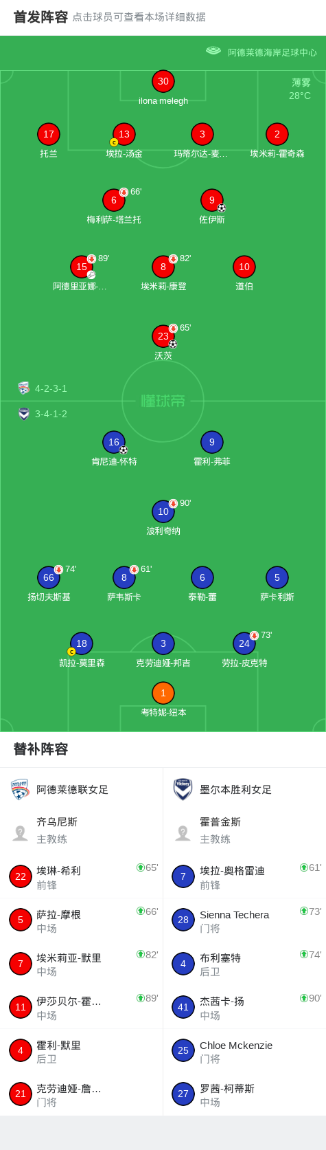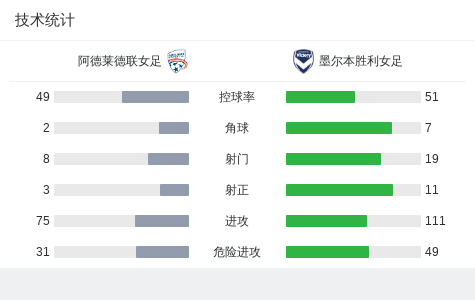 北京时间1月17日,澳大利亚女子足球A联赛第13轮,阿德莱德联女足主场迎战墨尔本胜利女足。比赛中,阿德莱德联女足率先打破僵局,塔兰托送出精准助攻,沃茨成功破门,为主队取得领先。上半场补时阶段,墨尔本胜利女足由肯尼迪-怀特攻入一球,将比分扳平。易边再战,阿德莱德联女足加强攻势,并在下半场由佐伊斯完成关键进球,帮助球队再度领先。此后双方均未能改写比分,最终阿德莱德联女足以2比1战胜墨尔本胜利女足,全取三分。