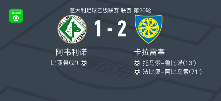 北京时间1月17日,意大利足球乙级联赛第20轮,阿韦利诺主场迎战卡拉雷塞。比赛伊始,图蒂诺送出助攻,比亚希为阿韦利诺率先破门。随后,法比奥-阿比乌索助攻托马索-鲁比诺扳平比分。进入下半场,法比奥-阿比乌索再入一球,帮助卡拉雷塞反超比分。最终全场比赛结束,阿韦利诺1-2不敌卡拉雷塞。
