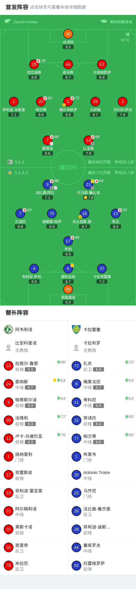 第13分钟,卡拉雷塞球员法比奥-阿比乌索助攻托马索-鲁比诺打入一球。