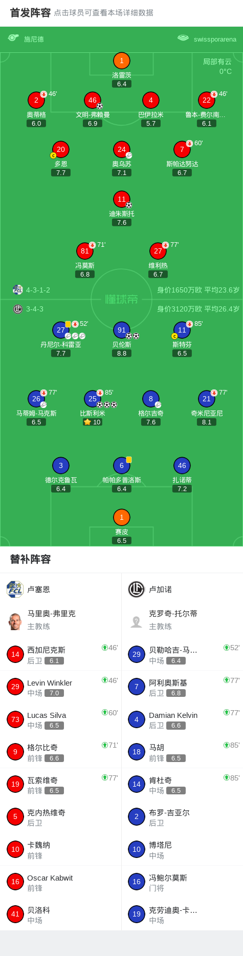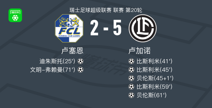 北京时间1月18日瑞士足球超级联赛 联赛 第20轮,卢塞恩主场对阵卢加诺。卢塞恩迪朱斯托破门,文明-弗赖曼破门。卢加诺比斯利米帽子戏法,贝伦斯梅开二度。最终比分卢塞恩 2-5 卢加诺。