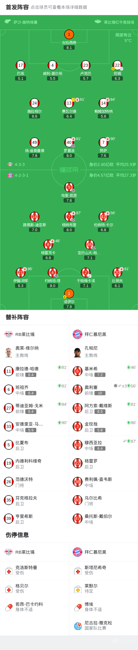 剑南春丨拜仁5-1莱比锡,奥利塞3传1射,穆西亚拉伤愈送助攻