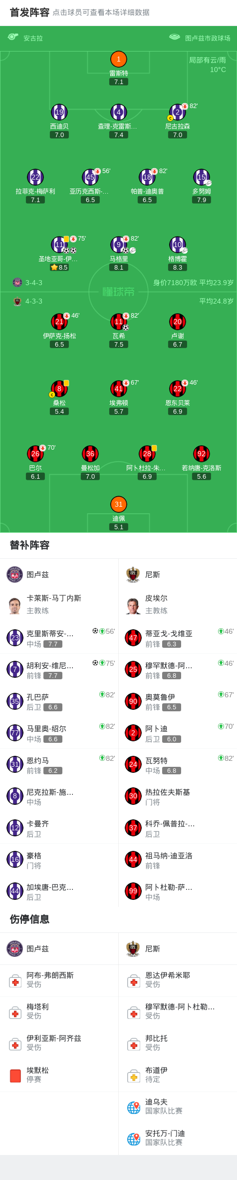 第80分钟,图卢兹球员胡利安-维尼奥洛打入一球。