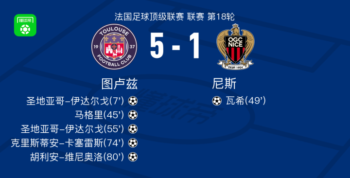 图卢兹5-1大胜尼斯,圣地亚哥-伊达尔戈梅开二度,胡利安-维尼奥洛破门