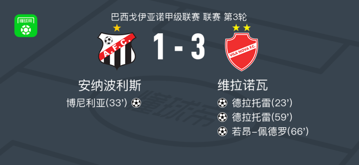 北京时间1月18日,巴西戈伊亚诺甲级联赛第3轮,安纳波利斯主场迎战维拉诺瓦。比赛中,维拉诺瓦球员德拉托雷率先打破僵局,帮助球队取得领先。随后,安纳波利斯球员博尼利亚迅速回应,将比分扳平。进入下半场,德拉托雷再度建功,完成个人梅开二度,为维拉诺瓦重新掌握优势。此后,若昂-佩德罗接队友进攻送出进球,进一步扩大比分。最终全场比赛结束,安纳波利斯以1比3不敌维拉诺瓦。