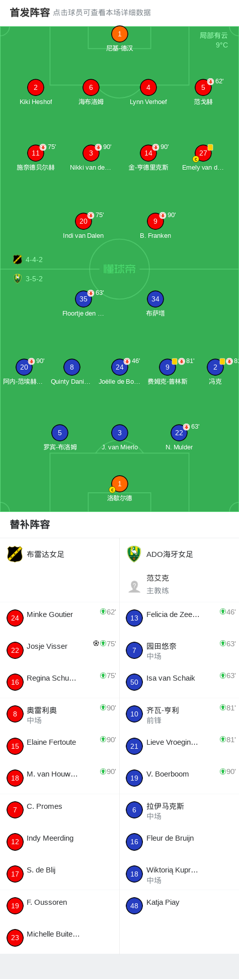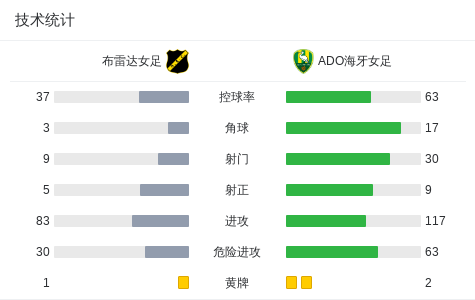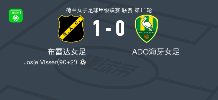 布雷达女足1-0ADO海牙女足,Josje Visser制胜战报bot @懂球帝01-18 21:18北京时间1月18日,荷兰女子足球甲级联赛第11轮,布雷达女足坐镇主场迎战ADO海牙女足。比赛中,布雷达女足球员Josje Visser攻入全场唯一进球,帮助球队取得领先。凭借这一进球,布雷达女足以1-0战胜对手,全取三分。点击查看本场比赛详细数据>>精彩瞬间下半场补时第2分钟,布雷达女足球员Josje Visser打入一球。 球队阵容 技术统计 展开更多