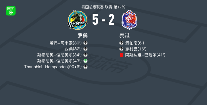 北京时间1月18日,泰国超级联赛第17轮展开角逐,罗勇坐镇主场迎战泰港。比赛伊始,泰港迅速取得领先,达那般送出助攻,素帕南推射建功。随后泰港再度利用进攻机会扩大优势,达那般再次完成助攻,志村誊破门得分。罗勇迅速作出回应,若昂-阿丰索为球队扳回一城。紧接着西桑抓住机会将比分进一步迫近。不久后,乍杜拉帕送出关键传球,斯泰尼奥-儒尼奥尔冷静施射得手,帮助球队实现反超。上半场临近结束阶段,泰港球员阿斯纳维-巴哈尔被红牌罚下,场上局势进一步向主队倾斜。随后斯泰尼奥-儒尼奥尔主罚点球命中,巩固了领先优势。下半场补时阶段,斯泰尼奥-儒尼奥尔送出助攻,Thanphisit Hempandan推射破门,将最终比分锁定。全场比赛结束,罗勇以5比2战胜泰港。