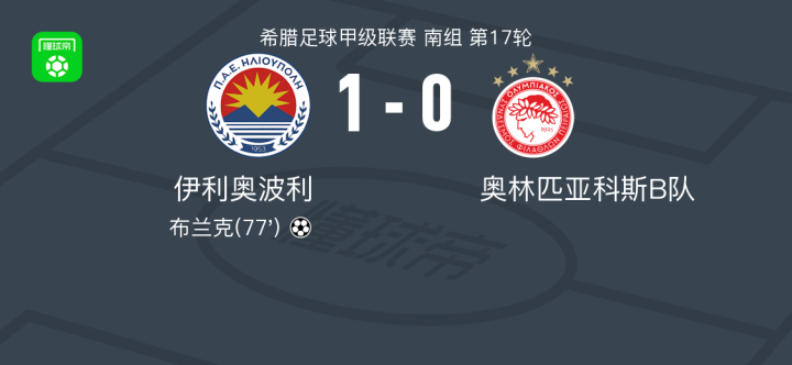 伊利奥波利1-0奥林匹亚科斯B队,布兰克一锤定音战报bot @懂球帝01-18 23:03北京时间1月18日,希腊足球甲级联赛南组第17轮,伊利奥波利主场迎战奥林匹亚科斯B队。比赛中,布兰克攻入全场唯一进球,帮助球队取得领先。凭借此球,伊利奥波利以1-0战胜对手,全取三分。点击查看本场比赛详细数据>>精彩瞬间第77分钟,伊利奥波利球员布兰克打入一球。 技术统计 展开更多
