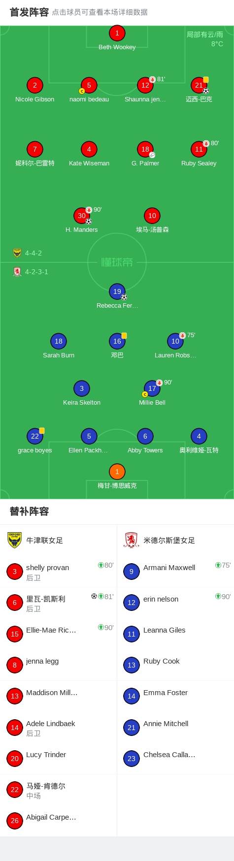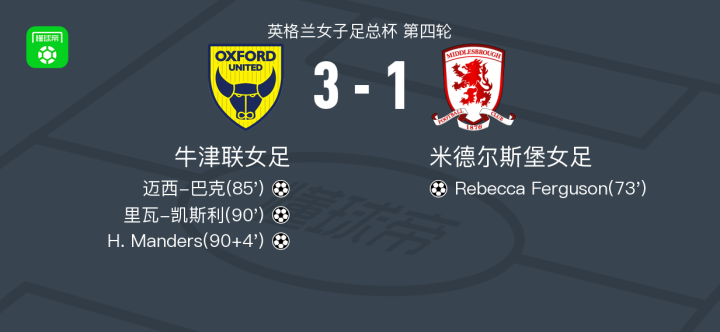 北京时间1月18日英格兰女子足总杯 第四轮,牛津联女足对阵米德尔斯堡女足。牛津联女足迈西-巴克破门,里瓦-凯斯利破门,H. Manders破门。米德尔斯堡女足Rebecca Ferguson破门。最终比分牛津联女足 3-1 米德尔斯堡女足。