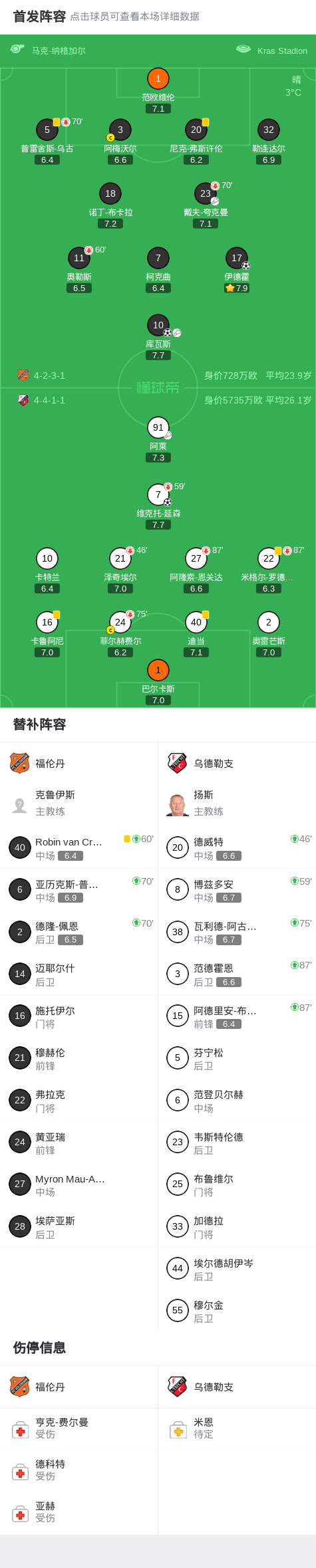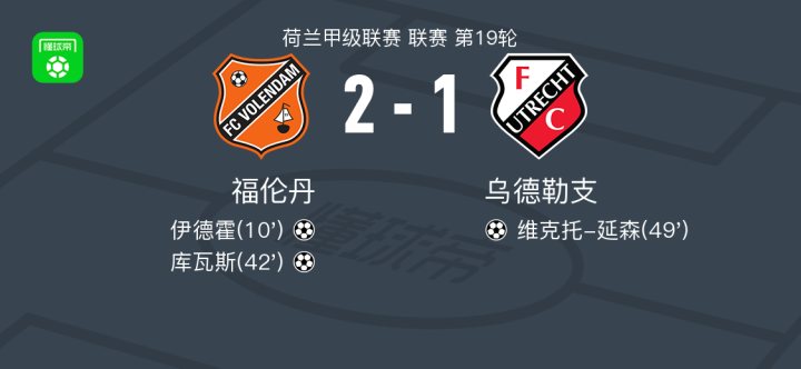北京时间1月18日荷兰甲级联赛 联赛 第19轮,福伦丹主场对阵乌德勒支。福伦丹伊德霍破门,库瓦斯破门。乌德勒支维克托-延森破门。最终比分福伦丹 2-1 乌德勒支。