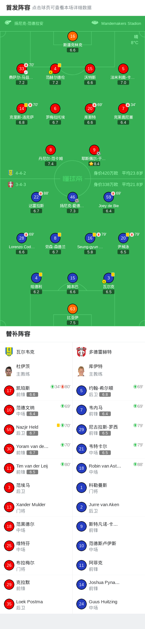 瓦尔韦克1-1多德雷赫特,耶斯佩尔-于内肯破僵,扬尼克-爱德华多救主