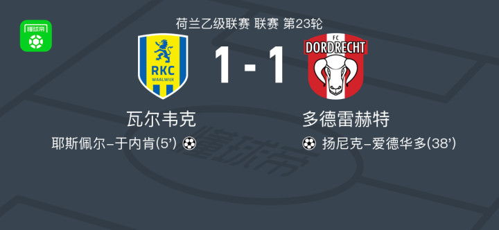 北京时间1月18日荷兰乙级联赛 联赛 第23轮,瓦尔韦克主场对阵多德雷赫特。瓦尔韦克耶斯佩尔-于内肯破门。多德雷赫特扬尼克-爱德华多破门。最终比分瓦尔韦克 1-1 多德雷赫特。