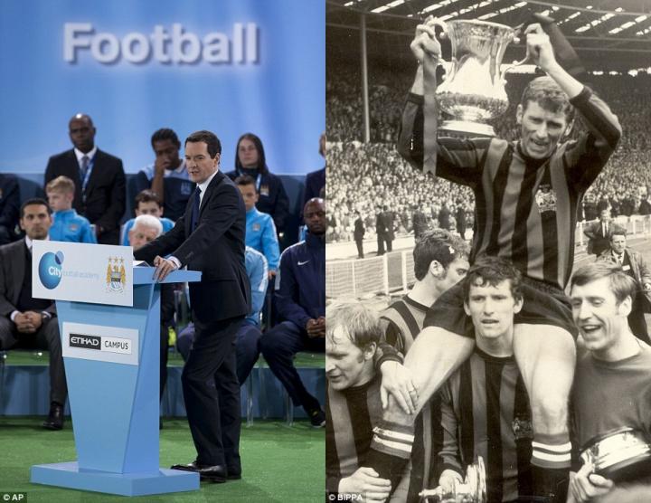 (图)财政大臣奥斯本(左)讲话,称赞了曼城为曼彻斯特的新生所做的努力;举着奖杯的布克(右)庆祝曼城击败莱斯特城赢得的1969年足总杯冠军