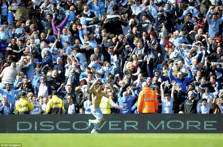 (图)阿圭罗庆祝曼城历史上最著名的一个进球——他的这个进球帮助曼城击败女王公园巡游者,获得2012年英超联赛冠军
