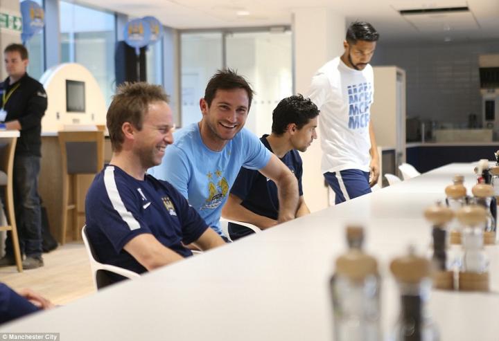 (图)曼城球员兰帕德(中)和纳瓦斯(右二)、克里希(右一)一起在新餐厅就餐