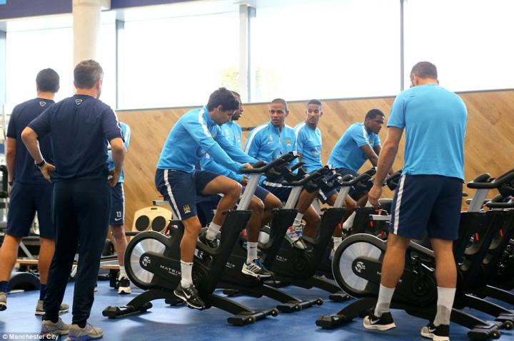 (图)曼城球员纳瓦斯、费尔南多(中)、辛克莱尔(右二)和博亚塔(右一)骑自行车以保持身体状态