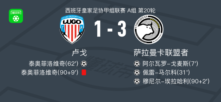 北京时间1月18日,西班牙皇家足协甲组联赛A组第20轮,卢戈主场迎战萨拉曼卡联盟者。比赛中,萨拉曼卡联盟者率先打破僵局,阿尔瓦罗-戈麦斯成功破门,帮助球队取得领先。随后佩雷-马尔科再入一球,进一步扩大优势。下半场,泰奥菲洛维奇为卢戈扳回一城,但未能扭转局势。补时阶段,穆尼尔-埃拉哈利再度建功,锁定胜局。比赛临近结束前,泰奥菲洛维奇因犯规被红牌罚下。最终全场比赛结束,卢戈1-3不敌萨拉曼卡联盟者。